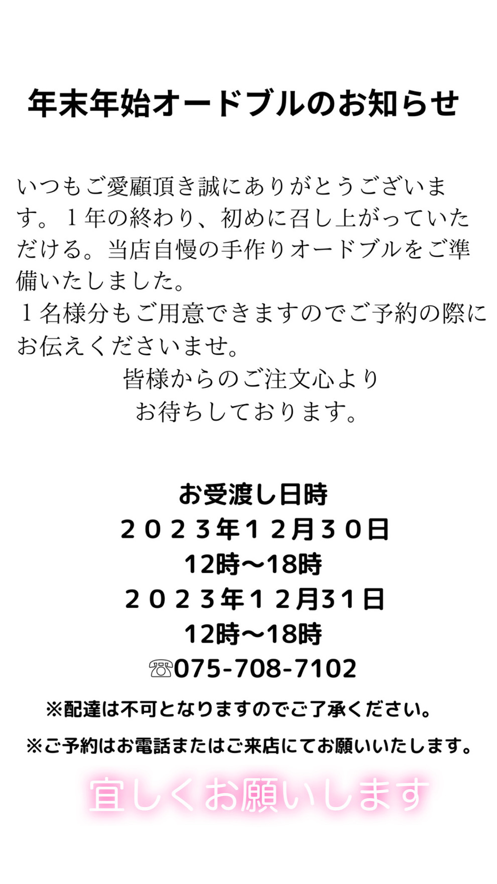 年末年始オードブルのご予約はお電話0757548459にて承っております。